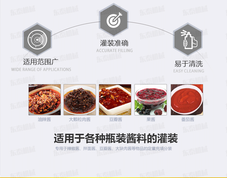 4、顆粒醬定量灌裝機主要針對食品行業(yè)的醬類分裝設計生產(chǎn),香菇醬灌裝機特別適用于調(diào)味品中帶顆粒并且濃度較大的辣椒醬、豆瓣醬、花生醬、芝麻醬、果醬、牛油火鍋底料、紅油火鍋底料等物質(zhì)的粘稠醬類的灌裝;