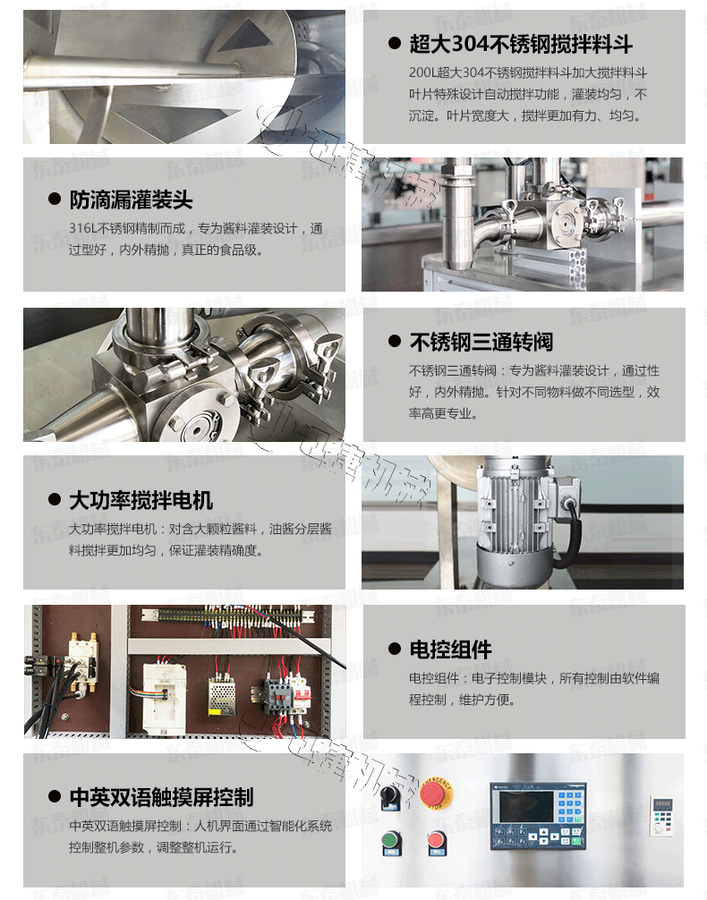 3、醬料灌裝機采用的臥式攪拌結(jié)構,醬和油可以得到充分混合,極大的提高計量的精度和灌裝性能;